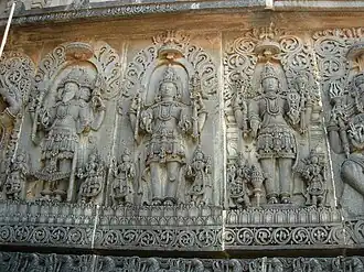 Trimūrti sur un mur du temple de Hoysaleśvara à Halebid (Karnataka).
