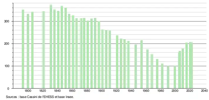 L'évolution du nombre d'habitants est connue à travers les recensements de la population effectués dans la commune depuis 1793. Pour les communes de moins de 10 000 habitants, une enquête de recensement portant sur toute la population est réalisée tous les cinq ans, les populations de référence des années intermédiaires étant quant à elles estimées par interpolation ou extrapolation[22]. Pour la commune, le premier recensement exhaustif entrant dans le cadre du nouveau dispositif a été réalisé en 2005[23].