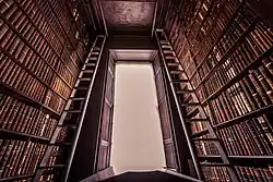 Avec une collection d'environ sept millions de livres imprimés et de manuscrits, la bibliothèque du Trinity College est une bibliothèque de dépôt légal d'Irlande et la seule en Irlande ayant des droits similaires à ceux du Royaume-Uni[7]. Une partie de l'ancienne bibliothèque est ouverte au public et abrite le Livre de Kells, un manuscrit décoratif du VIIIe siècle[8]. Elle attire plus de 600 000 visiteurs par an, ce qui en fait la troisième attraction touristique la plus visitée de Dublin[9].