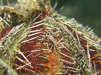 Cet oursin peut héberger certains symbiotes, comme les petites crevettes nettoyeuses du genre Periclimenes ou le crabe Zebrida adamsii, ou la minuscule crevette naine Gnathophylloides mineri, qui lui est un symbiote exclusif[5] .
