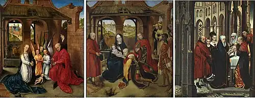 On a perdu la trace des faces extérieures des volets. Également appelé « Triptyque de Charles-Quint » parce qu'il était autrefois conservé dans l'« oratoire de Charles-Quint » du palais royal d'Aranjuez. Il s'agit d'une des œuvres les plus connues de Memling, acceptée par la totalité des auteurs[1].