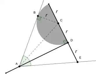 Si le sommet de l'angle est étiqueté A, le point de tangence de la lame est B, le centre du demi-cercle est C, le haut du manche est D et la pointe est E, alors les triangles △ACD et △ADE sont deux triangles rectangles ayant une base commune et une hauteur égale, ce sont donc des triangles égaux . Parce que les côtés AB et BC du triangle △ABC sont respectivement une tangente et un rayon du demi-cercle, ils sont perpendiculaires l'un à l'autre et △ABC est aussi un triangle rectangle ; il a la même hypoténuse que △ACD et les mêmes longueurs de côté BC = CD, donc encore une fois il est égal aux deux autres triangles, montrant que les trois angles formés au sommet sont égaux[5],[6].