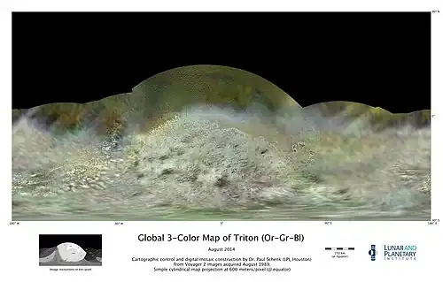 - ↑ (en) NASA Jet Propulsion Laboratory – Great Images in NASA « PIA00317: Global Color Mosaic of Triton. » .