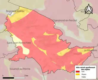 La commune est vulnérable au risque de mouvements de terrains constitué principalement du retrait-gonflement des sols argileux[15]. Cet aléa est susceptible d'engendrer des dommages importants aux bâtiments en cas d’alternance de périodes de sécheresse et de pluie. 95,4 % de la superficie communale est en aléa moyen ou fort (52,8 % au niveau départemental et 48,5 % au niveau national). Sur les 219 bâtiments dénombrés sur la commune en 2019, 213 sont en aléa moyen ou fort, soit 97 %, à comparer aux 70 % au niveau départemental et 54 % au niveau national. Une cartographie de l'exposition du territoire national au retrait gonflement des sols argileux est disponible sur le site du BRGM[16],[Carte 2].