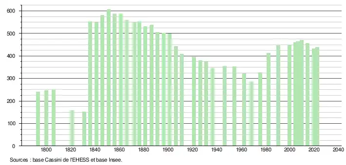 L'évolution du nombre d'habitants est connue à travers les recensements de la population effectués dans la commune depuis 1793. Pour les communes de moins de 10 000 habitants, une enquête de recensement portant sur toute la population est réalisée tous les cinq ans, les populations de référence des années intermédiaires étant quant à elles estimées par interpolation ou extrapolation[22]. Pour la commune, le premier recensement exhaustif entrant dans le cadre du nouveau dispositif a été réalisé en 2004[23].