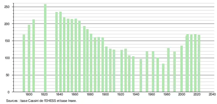 L'évolution du nombre d'habitants est connue à travers les recensements de la population effectués dans la commune depuis 1793. Pour les communes de moins de 10 000 habitants, une enquête de recensement portant sur toute la population est réalisée tous les cinq ans, les populations de référence des années intermédiaires étant quant à elles estimées par interpolation ou extrapolation[20]. Pour la commune, le premier recensement exhaustif entrant dans le cadre du nouveau dispositif a été réalisé en 2007[21].