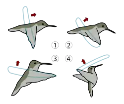 La structure osseuse de leurs ailes que l'on ne retrouve qu'au niveau du poignet des autres oiseaux assure une mobilité des épaules unique alors qu'elle est axée sur le seul mouvement vertical dirigé de haut en bas pour les autres oiseaux. Les oiseaux-mouches, grâce aux particularités de leur squelette, peuvent battre des ailes dans toutes les directions et faire des prouesses aériennes inégalées. Ils peuvent voler sur place en effectuant des mouvements de leurs ailes en forme de 8. Ils sont les seuls oiseaux capables de voler en arrière[27]. Leurs cabrioles peuvent être effectuées à une vitesse moyenne de 30 à 45 kilomètres par heure. Le vol d'avant en arrière ou le vol en piqué peuvent atteindre 96 kilomètres par heure avec jusqu'à 200 battements par seconde pour un vol en plongée. Selon des chercheurs américains, cet oiseau parvient à faire du sur-place en battant des ailes à 75 % vers le bas et à 25 % vers le haut[28]. Cette façon de voler rappelle le vol de certains insectes comme celui des Sphingidae.