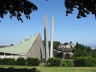 L'église Notre-Dame-de-l'Annonciation, construite en béton brut avec fausse voûte en lamellé-collé et murs partiellement en dalles de verre, date de 1968. Elle est l'œuvre des architectes Pierre Keller et Pierre Dumas. La flèche formée de trois piliers symbolisant les trois épis a été érigée en 1991 à côté de l'église, selon le projet de l'architecte Prioleau[4],[5]. Les vitraux sont signés Camille Hilaire.