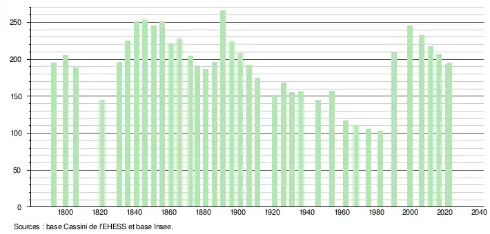 - ↑ Fiches Insee - Populations de référence de la commune pour les années 2006, 2007, 2008, 2009, 2010, 2011, 2012, 2013, 2014, 2015, 2016, 2017, 2018, 2019, 2020, 2021 et 2022.