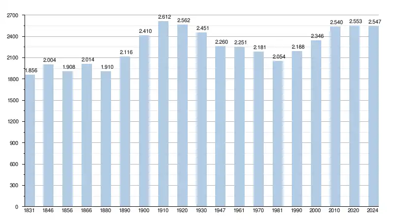 Les chiffres des années 1831 à 1970 tiennent compte des chiffres des anciennes communes fusionnées.
