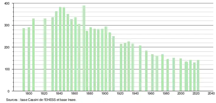 L'évolution du nombre d'habitants est connue à travers les recensements de la population effectués dans la commune depuis 1793. Pour les communes de moins de 10 000 habitants, une enquête de recensement portant sur toute la population est réalisée tous les cinq ans, les populations de référence des années intermédiaires étant quant à elles estimées par interpolation ou extrapolation[46]. Pour la commune, le premier recensement exhaustif entrant dans le cadre du nouveau dispositif a été réalisé en 2007[47].
