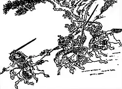 Liu Bei, lui aussi passé à la postérité comme un combattant remarquable, est issu d'une famille pauvre, déclassée. Il a su s'affirmer en dépit de nombreux revers, après avoir servi d'autres chefs de guerre (Gongsun Zan, Cao Cao, Yuan Shang). Il reçoit l'aide de ses compagnons loyaux, entrés comme lui dans la légende : les vaillants généraux Guan Yu et Zhang Fei et celui qui est considéré comme le plus brillant stratège de l'époque, Zhuge Liang[57]. D'autres ont eu moins de succès, mais représentent tout aussi bien ce groupe marqué par l'incertitude et les revers de fortune funestes. Yuan Shao, un des premiers généraux à émerger au moment de la chute des Han, se constitue une base territoriale mais subit une défaite face à Cao Cao peu avant de mourir. Ses fils Yuan Shang (en) et Yuan Tan (en) se querellent ensuite pour récupérer l'héritage paternel et finissent tués par d'autres chefs de guerre[22].