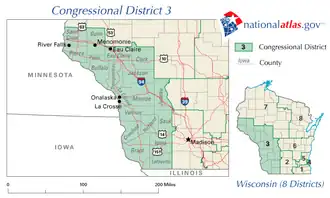 Le 3e district congressionnelle du Wisconsin couvre la majeure partie de la zone Driftless dans le sud-ouest et l'ouest du Wisconsin. Le district comprend les villes d'Eau Claire, La Crosse et Stevens Point, ainsi que de nombreuses banlieues de la Région Métropolitaine de Minneapolis-St. Paul. Il borde les États du Minnesota, de l'Iowa et de l'Illinois. Le Républicain Derrick Van Orden représente le district depuis 2023.