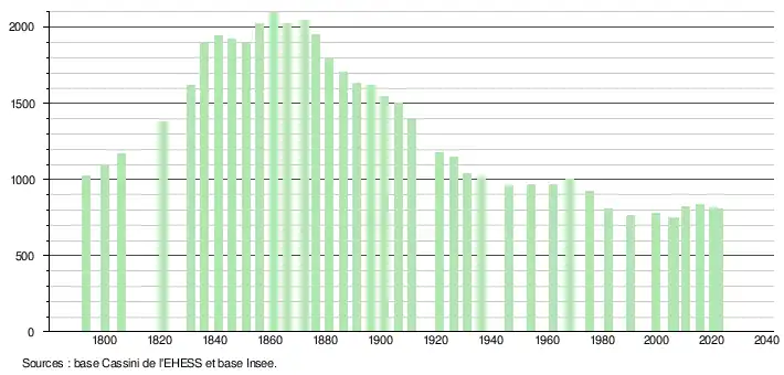 L'évolution du nombre d'habitants est connue à travers les recensements de la population effectués dans la commune depuis 1793. Pour les communes de moins de 10 000 habitants, une enquête de recensement portant sur toute la population est réalisée tous les cinq ans, les populations de référence des années intermédiaires étant quant à elles estimées par interpolation ou extrapolation[33]. Pour la commune, le premier recensement exhaustif entrant dans le cadre du nouveau dispositif a été réalisé en 2005[34].