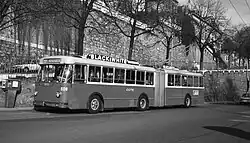 | Articulé[27] | Berna/SWS | SAAS | 21 | 601-621 en 1988 : 609, 618 et 607 renumérotés 32, 96 et 99 (véhicules école) | 1965 | 1988 (601, 606, 608, 610, 614, 619 et 620) 1991 (32 et 96) 1992 (99, 602 à 605, 611 à 613, 615 à 617 et 621) | Première série de trolleybus articulés à Genève. | ![]() |