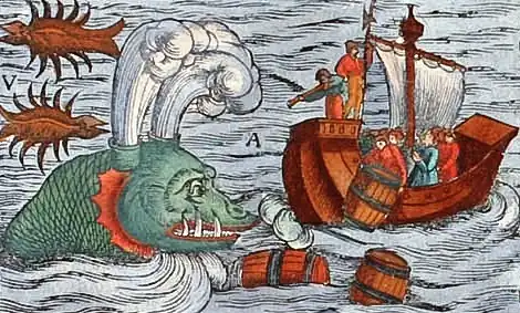 Une vignette de l'ouvrage de Gessner reprend ainsi l'illustration de la Carta Marina représentant des marins ayant jeté l'ancre sur une baleine qu'ils ont confondue avec une île.