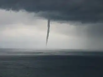 Une trombe marine est une colonne d'air mélangé d'eau en rotation, formant un entonnoir nuageux, sous un nuage convectif au-dessus d'une étendue d'eau[1],[2]. Ces phénomènes de micro-échelle se forment lorsque les conditions sont très instables alors que de l'air froid passe au-dessus d'eaux chaudes. Généralement moins intenses qu'une tornade, elles se dissipent une fois sur la terre. Il en existe deux types : les trombes d'air froid et les trombes tornadiques[2].