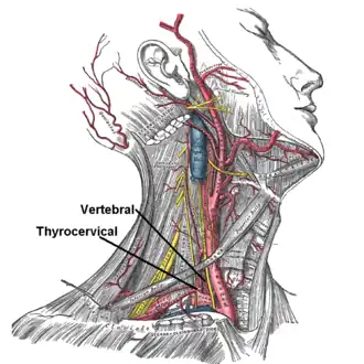 Le tronc thyro-cervical est une branche de l'artère subclavière[1],[2]. Il naît de la face supérieure de la première portion de ce vaisseau, entre son origine et le bord interne du muscle scalène antérieur.