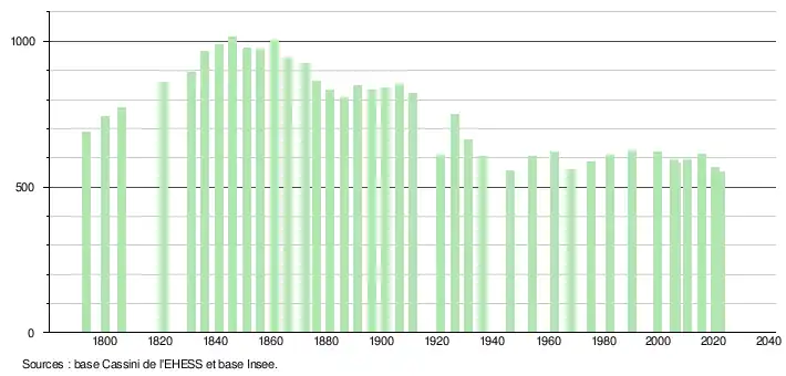 L'évolution du nombre d'habitants est connue à travers les recensements de la population effectués dans la commune depuis 1793. Pour les communes de moins de 10 000 habitants, une enquête de recensement portant sur toute la population est réalisée tous les cinq ans, les populations de référence des années intermédiaires étant quant à elles estimées par interpolation ou extrapolation[37]. Pour la commune, le premier recensement exhaustif entrant dans le cadre du nouveau dispositif a été réalisé en 2005[38].