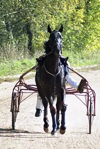 Trotteur français | 1922 | Entre 1,60 m à 1,70 m au garrot. Il peut porter un cavalier pesant jusqu'à 75 kg sur des distances allant de 1609 à 4150m. Il est le seul trotteur au monde à pouvoir courir aussi bien à l'attelé qu'au monté. Rapide, caractère facile, résistant. Il peut courir de ses deux ans à 10 ans. Principalement bai ou alezan. | ||