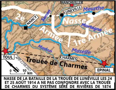 | Lieu | En Meurthe-et-Moselle (alors allemande), ligne de 27 km de direction NO-SE entre Crévic (en rive gauche du Sânon) et Baccarat (sur la Meurthe) en passant par Lunéville (25 587 habitants en 1911). Ligne sans forces françaises servant d’ouverture à la nasse rectangulaire de 450 km² (15 km de profondeur vers le SO et 30 km de largeur). Nasse limitée au NE par la Meurthe et traversée du NO au SE par son affluent de rive gauche la Mortagne de Mont-sur-Meurthe à Roville-aux-Chênes |