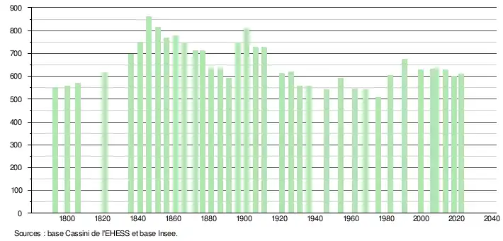 L'évolution du nombre d'habitants est connue à travers les recensements de la population effectués dans la commune depuis 1793. Pour les communes de moins de 10 000 habitants, une enquête de recensement portant sur toute la population est réalisée tous les cinq ans, les populations de référence des années intermédiaires étant quant à elles estimées par interpolation ou extrapolation[16]. Pour la commune, le premier recensement exhaustif entrant dans le cadre du nouveau dispositif a été réalisé en 2008[17].