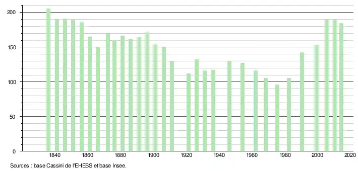 L'évolution du nombre d'habitants est connue à travers les recensements de la population effectués dans la commune depuis 1836. À partir du , les populations légales des communes sont publiées annuellement dans le cadre d'un recensement qui repose désormais sur une collecte d'information annuelle, concernant successivement tous les territoires communaux au cours d'une période de cinq ans. Pour les communes de moins de 10 000 habitants, une enquête de recensement portant sur toute la population est réalisée tous les cinq ans, les populations légales des années intermédiaires étant quant à elles estimées par interpolation ou extrapolation[7]. Pour la commune, le premier recensement exhaustif entrant dans le cadre du nouveau dispositif a été réalisé en 2005[8],[Note 1].