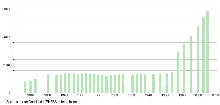 L'évolution du nombre d'habitants est connue à travers les recensements de la population effectués dans la commune depuis 1793. À partir du , les populations légales des communes sont publiées annuellement dans le cadre d'un recensement qui repose désormais sur une collecte d'information annuelle, concernant successivement tous les territoires communaux au cours d'une période de cinq ans. Pour les communes de moins de 10 000 habitants, une enquête de recensement portant sur toute la population est réalisée tous les cinq ans, les populations légales des années intermédiaires étant quant à elles estimées par interpolation ou extrapolation[3]. Pour la commune, le premier recensement exhaustif entrant dans le cadre du nouveau dispositif a été réalisé en 2005[4],[Note 1].