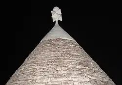 Des symboles chrétiens sont parfois peints au lait de chaux sur certaines coupoles d'habitations (les trulli à usage d'écurie ou de pailler en sont exempts). Le cône central du Trullo Sovrano à Alberobello se vit ainsi gratifié d'un symbole religieux dans le premier tiers du XXe siècle[34]. L'alignement de trulli de la rue Monte Pertica a acquis ses symboles lors de la réfection des toitures à la fin du XXe siècle et au début du XXIe : croix, cœur transpercé, hostie rayonnante, croix à l'arbre, colombe rayonnante symbolisant le Saint-Esprit, croissant de lune avec croix[b]. Fruits de l'invention et non de la tradition, les symboles profanes visibles sur les cônes à la trullo des bungalows de l'Hotel dei trulli en haut du Rione Monti, sont de la fin des années 1950, date à laquelle cet hôtel fut construit : candélabre à 7 branches, prière montant vers Dieu, trident, cartouche surmonté d'une croix et divisé en quatre quartiers abritant les initiales de Santo Cosma et Santo Damiano, les deux saints auxquels est consacrée la basilique locale, cœur coiffé d'une croix et transpercé par une flèche, la pointe vers le bas (censé symboliser Notre Dame des Sept Douleurs, Santa Maria Addolorata en italien).
