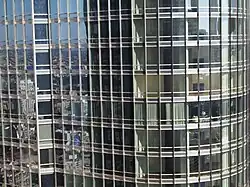 Le mur-rideau du bâtiment, réalisé par l'entreprise italienne d'ingénierie Permasteelisa[7], utilise un verre clair à revêtement à faible émissivité et un système de meneaux en acier inoxydable poli en forme d'ailes incurvées qui dépassent de 9 pouces (23 cm) de la ligne de vitrage. Il intègre des panneaux d'allège en acier inoxydable brossé et en aluminium anodisé transparent.