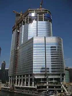 Toutefois, lorsqu'elle fut présentée au public, la première version du gratte-ciel ne rencontra pas d'engouement auprès des habitants de Chicago et l'on doit l'apparence du bâtiment actuel à une révision ultérieure des plans en juillet 2002. En janvier 2004, une autre révision modifia le contenu des étages 17 à 26 et installa des appartements et des chambres d'hôtel en lieu et place des bureaux. Les travaux de construction commencèrent le .