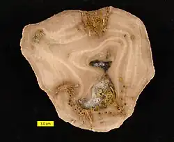 Trypanites est une trace fossile en forme de cylindre étroit formée par une inclusion dans un substrat solide comme une coquille, une roche ou des sédiments solidifiés.