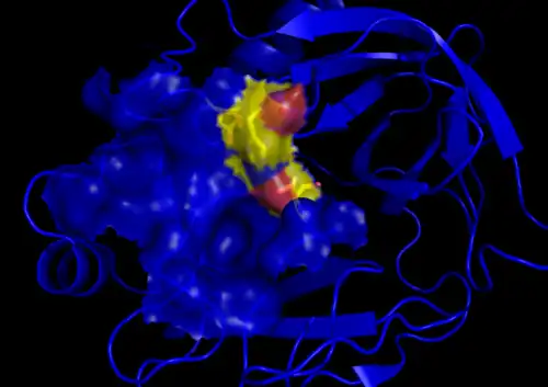 Trypsine humaine (PDB 4WWY) avec la triade catalytique mise en évidence : l'aspartate 102 est en mauve, l'histidine 57 en cyan et la sérine 195 en rouge. | ||