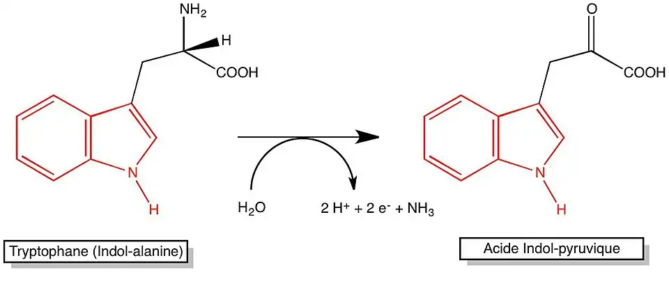 La tryptophane désaminase (TDA) est une oxydoréductase capable de catalyser la libération du groupement amine primaire du tryptophane (W) avec production d'acide indole-pyruvique (AIP), d'ammoniac (ou d'ammonium en fonction du pH) et d'un coenzyme réduit, selon la réaction :