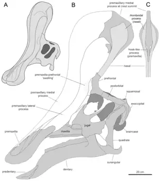 Tsintaosaurus a d'abord été décrit comme un hadrosaure avec une crête en forme de corne sur le sommet du crâne. Cette hypothèse, largement remise en cause chez les paléontologues, a été totalement réfutée grâce à la découverte de nouveaux fossiles[3]. En 2013, Albert Prieto-Márquez et Jonathan Wagner démontrent que le morceau d'os pris pour une corne n'était que la partie arrière d'une large crête qui partait de l'extrémité du museau pour se développer jusqu'au-dessus de l'arrière du crâne[3].