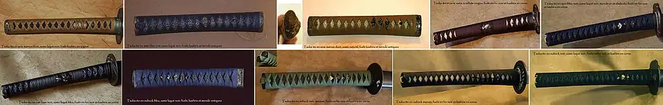 Il existe de nombreux types de tressage différents. Le blocage du nakago de la lame est assuré par une cheville en bambou, le mekugi, le jeu contre le tsuba est assuré par un ou plusieurs seppa (petites pièces ajourées découpées dans une feuille de cuivre ou de laiton).