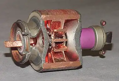 Le magnétron est un tube à vide sans grille d'arrêt, avec une cathode centrale, chauffée par un filament, et une anode massique et concentrique dans laquelle sont creusées plusieurs cavités résonnantes. Un champ magnétique axial est généralement créé par deux aimants permanents à chaque extrémité du tube. Le parcours en spirale (du fait du champ magnétique) des électrons se fait à une fréquence accordée aux cavités résonnantes.