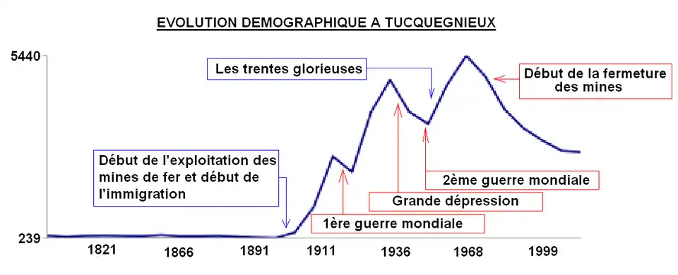 Dès le début du XXe siècle, c'est le commencement de l'exploitation minière du sous-sol lorrain, avec un apport massif de main-d’œuvre immigrée, notamment italienne, puis polonaise. Dès 1901-1902, arrivent les premiers Italiens qui participent à la construction du puits de mine de Tucquegnieux village, ainsi qu’à la construction des cités du village. Une fois installés, ces hommes faisaient venir leur famille. L’immigration polonaise s’effectuera par la suite en deux temps. Tout d’abord, de 1922 à 1931, réquisitionnés par le gouvernement polonais, avec l’accord du gouvernement français, ils étaient convoyés par train dans des wagons de marchandises et arrivaient à la gare de Toul. Là, des gardes à la solde des directeurs de mine venaient choisir ceux qui leur convenaient et les embauchaient sous contrat d’un an. Ce contrat était renouvelé d’année en année, sous condition d'une conduite exemplaire. Le second temps s’est effectué au cours et à l’issue de la Seconde Guerre mondiale. Il y eut également une période d’immigration yougoslave qui s’est déroulée de 1922 à 1931. Après guerre, il y eut une nouvelle poussée peu importante d’immigration italienne. Les archives municipales montrent de 1922 à 1926, un mouvement de population étrangère égal à 7 500 personnes. Ceci est principalement dû au fait que beaucoup de personnes travaillaient quelques mois puis partaient pour d’autres mines.