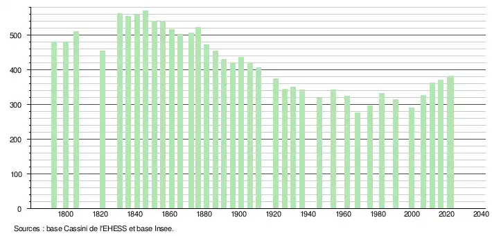 L'évolution du nombre d'habitants est connue à travers les recensements de la population effectués dans la commune depuis 1793. Pour les communes de moins de 10 000 habitants, une enquête de recensement portant sur toute la population est réalisée tous les cinq ans, les populations de référence des années intermédiaires étant quant à elles estimées par interpolation ou extrapolation[15]. Pour la commune, le premier recensement exhaustif entrant dans le cadre du nouveau dispositif a été réalisé en 2006[16].