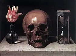 Lorsque le Flamand Philippe de Champaigne peint la Vanité ci-contre à l’austérité toute janséniste en 1646, il n’a besoin que de trois objets pour résumer la vie humaine : tout est dit avec le crâne (memento mori), le sablier qui marque la fuite du temps et la tulipe flammée dans un vase bulle. Neuf ans après la crise de la tulipe, la fleur, ici une variété panachée précieuse, reste pour ses contemporains une métonymie riche de sens, qui évoque nécessairement l’orgueil, la chute et la vanité des entreprises humaines[82].