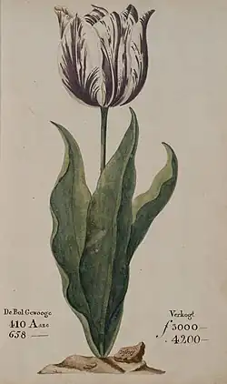 - ↑ Le musée Boijmans van Beuningen de Rotterdam possède même des carreaux de faïence représentant des variétés rares et chères de tulipes, probablement copiées à partir des herbiers peints des botanistes (en) cartel du musée, « Tulip tiles, anonymous, Netherland c. 1640 (Carreaux avec tulipes, anonyme, Pays-Bas vers 1640) », page consultée le