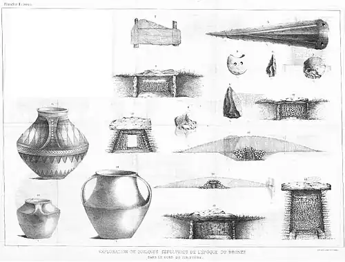 - ↑ Par convention, "Tumulus armoricains" désignent les sépultures individuelles de l'Âge du bronze pouvant être recouvertes d'un tumulus et non l'ensemble des tumulus de Bretagne, dont les datations s'échelonnent du Néolithique (par exemple tumulus Saint-Michel) au Haut-Moyen-Âge (par exemple la sépulture viking de Groix).