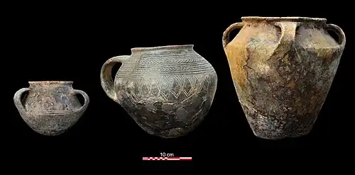 La céramique n’est jamais découverte dans ces tombes de chefs. Elle est généralement de forme biconique associée bien souvent à des anses en nombre variable (1 à 6). Elle peut être décorée de chevrons, de triangles hachurés et de cannelures.