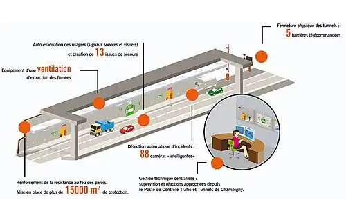Parallèlement à ces travaux, les transmissions radio ont été revues pour une meilleure transmission des informations à l’intérieur du tunnel, et les réseaux de télécommunication avec les Postes de commandements (PC) ont été renforcés. La « gestion technique centralisée » installée au sein des PC permet désormais aux « opérateurs sécurité trafic » (OST), d’être informés en temps réel des incidents graves dans les tunnels et de réagir de façon optimale en fonction de la gravité de chaque situation.