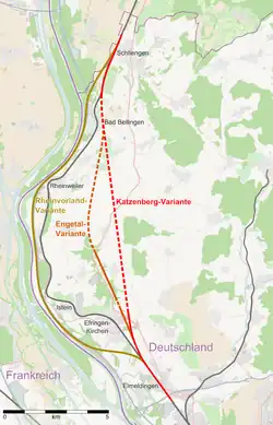 Au début des années 1980, plusieurs variantes de projets étaient en discussion. La « Rheinvorlandvariante » devait se situer à l'est du Rhin parallèlement à l'autoroute A 5 et autoriser une vitesse de 200 km/h mais aurait eu un impact important sur l'utilisation et l'aménagement du terrain. Deux autres variantes, « Engetal » et « Katzenberg », ont aussi été développées, toutes deux comprenant des tunnels de longueurs allant jusqu'à 8 km[2]. En outre, existait également la « Zimmermann-Variante », qui prévoyait le renforcement de l'ancienne ligne. La Bundesbahn favorisait la « Rheinvorlandvariante », mais les communes concernées l'ont critiquée. C'est finalement la variante « Katzenberg » qui a été retenue et réalisée par l'ingénieur Albert Schmid.