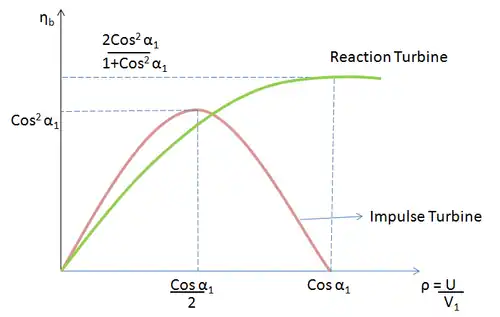 est maximale lorsque ou, . Cela implique que et donc . Maintenant (pour une turbine à action d'un seul étage)