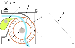 Une turbine Banki est une turbine à action et contrairement à la plupart des autres turbines hydrauliques, qui ont un flux axial ou radial, une turbine Banki a un flux transversal. C'est-à-dire que l'eau s'écoule au travers des pales de la turbine. Comme pour une roue à aubes, l'eau entre par un côté de la turbine et ressort par le côté opposé. L'eau traverse ainsi deux fois les pales de la turbine. Il n'y a pas de gain d'efficacité à espérer de ce type de turbine ; le choix dépend du débit, de la hauteur de chute et du rendement souhaité. Ce type de turbine opère à basse vitesse, car il serait inefficace à grande vitesse et grand débit[1].