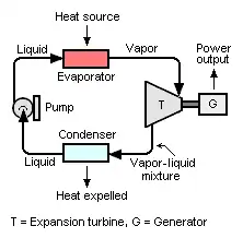 Le système présenté sur le schéma est un cycle de Rankine tel qu'utilisé dans les centrales thermiques à combustibles fossiles, l'eau étant le fluide de travail et la source de chaleur étant la combustion du gaz naturel, du fioul ou du charbon utilisé pour générer de la vapeur à haute pression. La vapeur à haute pression subit alors une détente isentropique dans une turbine à vapeur classique. La vapeur d'échappement de la turbine à vapeur est ensuite condensée en eau liquide, qui est ensuite pompée vers le générateur de vapeur pour terminer le cycle.