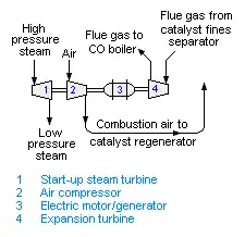 Comme le montre la figure, la détente des gaz de combustion à travers une turbine d'expansion fournit une puissance suffisante pour entraîner le compresseur d'air de combustion du régénérateur. Le groupe convertisseur du système de récupération peut consommer ou produire de l'énergie électrique. Si la détente des fumées ne fournit pas suffisamment de puissance pour entraîner le compresseur d'air, le groupe convertisseur fournit la puissance supplémentaire nécessaire. Si la détente fournit plus de puissance que nécessaire pour entraîner le compresseur d'air, le groupe convertisseur transforme l'excédent de puissance mécanique en énergie électrique qui peut ensuite être utilisé pour d'autres procédés dans la raffinerie[19]. La turbine à vapeur est utilisée pour entraîner le compresseur d'air du régénérateur lors des démarrages du craqueur catalytique à lit fluidisé jusqu'à ce qu'il y ait suffisamment de gaz de combustion pour prendre en charge cette tâche.