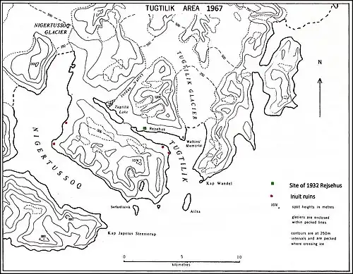 À la suite du succès de son expédition sur la route aérienne de l'Arctique en 1930-1931, Gino Watkins retourne à Tugtilik en 1932 pour poursuivre des travaux d'exploration avec une équipe plus petite[5]. L'un des objectifs de l'expédition est de faire des observations métrologiques autour du lac, le seul endroit de la région où les avions peuvent atterrir sur des skis ou des flotteurs, sans risquer les icebergs et la banquise. Le 20 août 1932, il trouve la mort dans ce fjord après avoir chassé les phoques dans ses eaux. Plus tard dans la journée, son kayak vide est découvert flottant à l'envers par ses compagnons. Son corps n'a jamais été retrouvé[6].